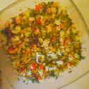 Le lendemain matin, couper les tomates épépinées, le concombre épluché (ou pas, il paraît que garder la peau du concombre facilite sa digestion. Dans les pays méditerranéens, on ne l'épluche jamais) ainsi que le poivron et les oignons nouveaux en petits dés, ni trop gros ni trop petits, c'est là que réside toute la difficulté. Vous pouvez même ajouter la tige des oignons nouveaux, mais pas toute la botte, ce serait trop. Hacher finement la menthe fraîche, et éventuellement les autres herbes aromatiques fraîches, lavées et équeutées (je le précise, on ne sait jamais). Ajouter l'ensemble à la préparation de semoule qui a dû gonfler.