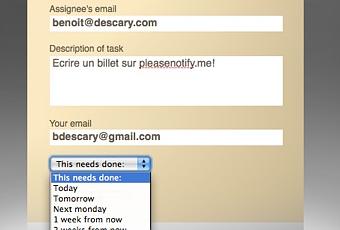 Vous désirez déléguer une tâche à un collaborateur ou à un ami et être automatiquement prévenu lorsqu’elle sera réalisée? Un nouveau service qui se nomme pleasenotify.me vous permet de créer une tâche, d’établir une date d’échéance et de l’envoyer par courriel à votre contact.