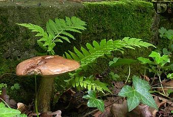 Dans un coin de la pelouse cela s'est traduit par cette caricature de sous bois. Spontanément, un champignon s'est invité aux côtés de la fougère, du lierre, de la mousse et de quelques feuilles mortes. L'automne au printemps.