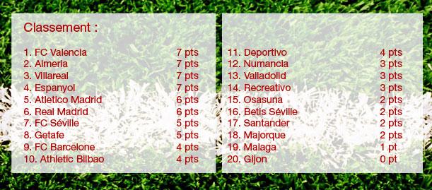 Alors qu'il était blessé à la cheville, David Villa était titularisé avec Valence qui recevait Osasuna. L'international espagnol se montrait décisif en offrant l'unique but du match à Mata à douze minutes de la fin du temps règlementaire. Valence s'installe en tête grâce à sa différence de but. Il totalise sept points au même titre que Villareal qui s'est imposé 1-2 à Numancia avec notamment un but de Cazorla.