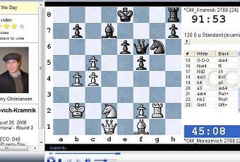 Vladimir Kramnik avec les noirs, à Alexander Morozevich, lors du Mémorial Tal 2008. La partie est expliquée par le grand-maître d'échecs américain Larry Christiansen.
