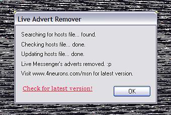 Il existe un patch pour enlever les publicités dans MSN Messenger, en fait celui-ci n’enlève pas les bandeaux de pubs mais affiche a la place une image fixe. Le patch “Live Adv Remover” fonctionne avec Windows Live Messenger 9. Il faut signaler que ce petit logiciel ne patch pas directement Messenger ce qui rendrait l’opération inefficace en cas de mise à jour, il agit sur le fichier host, en bloquant l’affichage des bandeaux qui viennent de l’internet.