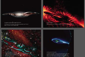 fascinantes, plus ou moins irréelles puisque ce sont les résultats des calculs d’ordinateurs associés aux téléscopes électroniques et non pas des visions réelles, des impressions rétiniennes directes. La première photo numérique de l’histoire fut faite par le télescope Hubble en 1990. Ce sont certaines de ces images astronomiques que l’artiste russe Julia Milner a