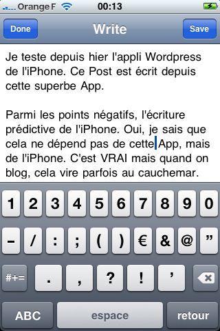 Parmi les points négatifs, l’écriture prédictive de l’iPhone. Oui, je sais que cela ne dépend pas de cette App, mais de l’iPhone. C’est VRAI mais quand on blog, cela vire parfois au cauchemar. Dommage que les applis iPhone pâtissent des défauts de la pomme.