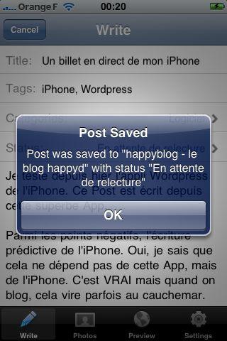Je teste depuis hier l’appli Wordpress de l’iPhone. Ce Post est écrit depuis cette superbe App gratuite.