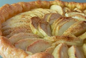 Ingrédients : 1 pâte feuilletées (c'est un de mes prochains défis, je n'ai jamais essayé encore) - 4 + 3 pommes Golden - 4 + 1 cuillères à soupe de sucre - 1 cuillère à soupe de poudre à flan (genre crème Jock) - 1 gousse de vanille - 1pincée de cannelle en poudre