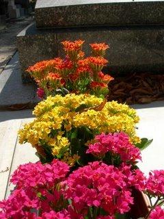 Loin de moi tout esprit morbide, bien au contraire, car la fleur est pour moi signe de renouveau, de vie. Ornement funéraire, touche de vie et de gaité, marque d'affection et de mémoire, le végétal joue dans ce lieu un rôle plus important qu'on ne le réalise souvent. Loin du bouquet éphémère déposé très vite le jour de l'enterrement et tout aussi vite passé et oublié, la fleur installée dans un pot ou une jardinière est un symbole fort du lien qui unit vivants et morts, de cette mémoire qui perdure par delà les générations.Mais ces lieux de mémoire sont des jardins bien difficiles pour les pauvres plantes souvent confinées dans des contenants exigüs, exposées en plein cagnard en été ou au froid le plus vif en hiver et pas toujours soignées fréquemment. Les espèces qui résistent et restent belles, vaille que vaille, le temps d'un été ou d'un hiver ne sont pas nombreuses avec de telles conditions.