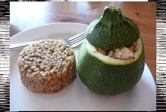 Lorsque les courgettes farcies sont cuites, les-disposer à côté du riz.