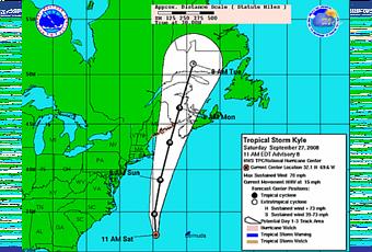 Actuellement, les vents de la tempête tropicale Kyle atteignent les 110 km/h avec des rafales à plus de 145 km/h. Dans les 34 prochaines heures, le système Kyle va certainement se renforcer ce qui est assez surprenant car les eaux que traverse le système sont de plus en plus froides.