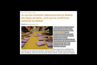 A 13h40, les lecteurs de MonModem.com Monputeaux.com ont découvert, dans un billet dissimulé derrière celui du 26 septembre sur les "Tontons flingueurs" des Hauts-de-Seine, que la défaite d'hier est en fait une victoire. D'abord parce que, par le jeu de la proportionnelle, Christophe Grébert est élu Conseiller départemental et à la Conférence nationale du MoDem. Ensuite, parce, selon lui, le score obtenu par ses listes est très au-dessus de ce qui était attendu : "Au terme d'une campagne interne de 5 semaines, où nous n'étions absolument pas attendus, la liste "Vraiment MoDem"