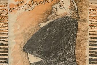 Maurice de Waleffe raconte qu'à la table de Mendès au café Napolitain, "résonnaient dès l'entrée les glapissements suraigus de la voix eunuquoïde d'Ernest La Jeunesse" [...] Grand diable hirsute, mal peigné, mal rasé, d'énormes bagues de pierres de couleur à tous mes doigts [...] Souvent dans cet entourage de Mendès on voyait apparaitre, derrière le torse de belluaire en chandail du beau Jean Richepin, la barbe de Silène de Raoul Ponchon, mais le plus fidèle au poste était Courteline, avec sa petite moustache ébouriffée sous un nez gouailleur de bistrot faubourien. " C'est notre Molière ! ", disait de lui gravement Mendès qui l'admirait." Courteline que La Jeunesse n'a pas manqué de croquer ici.