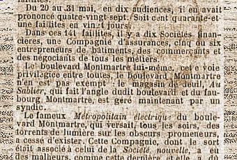 Juste un petit rappel : la grève des mineurs d'Anzun se termina le 16 avril 1884 (Germinal de Zola) Dans cet article du 27 juin 1884, le tribunal de commerce annonce une série de faillites, 141 en tout rien que pour une semaine !!! Ce sont des sociétés financières,une Compagnie d'assurances, des entrepreneurs de bâtiments et des commerçants de tous métiers. Le magasin de deuil "Au Sablier" à l'angle du boulevard Montmartre et du faubourg est en liquidation judiciaire. A l'autre angle du boulevard et de la rue Drouot, c'est la "Société du Métropolitain électrique" qui doit céder la place à "La Compagnie fermière des Eaux de Vichy". Cette dernière fut remplacée par le fameux "Café d'Angleterre". C'est aujourd'hui un fast-food....