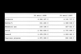 Voici un résumé des résultats financiers consolidés de de 4306112 Canada inc. pour ses deux dernières années financières terminées le 30 avril: