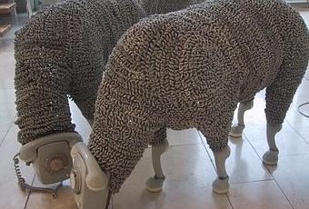 Des moutons en fil de téléphone ; le corps fait entièrement avec ces anciens fils hyper pénibles qui s'enroulent tout le temps. Et la tête avec le téléphone lui-même. C'est tout. Mais je trouve ça génial.