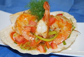 mettre des légumes au fond d'une coquille , ajouter les gambas, les dés de tomates et verser la sauce par dessus