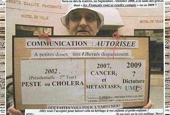 Depuis Juin 2008, le samedi, je déambule en homme sandwich sur le marché de Crest (26) pour dénoncer, de 10H00 à 12H30 les dérives globales et dangereuses de nos gouvernants et en dénonçant Edvige.