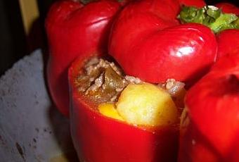 Préchauffez le four à 200°. Coupez la pomme de terre et la carotte en cubes. Faites les cuire dans un grand volume d'eau salée départ à froid pour la pomme de terre, sortez les quand elles sont tendres. Pendant ce temps lavez les poivrons, coupez le dessus pour en faire un chapeau, enlevez les pépins et la partie blanche. Mettez les dans un plat à four préalablement graissé. Tapissez le fond des poivrons avec des lamelles de cheddar. Dans une sauteuse faites revenir l'oignon avec un peu d'huile. Ajoutez la viande hachée, faites la cuire jusqu'à ce quelle ne soit plus rosée. Ajoutez les légumes et la salsa. Déposez la farce dans les poivrons, recouvrez les avec leurs chapeaux et enfournez les pendant 30 minutes.
