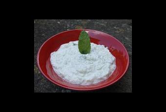 Versez dans un bol, ajoutez le fjord, la menthe ciselée, une gousse d’ail écrasée, du sel et du poivre.