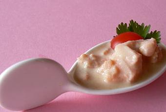 Ingrédients (20 cuillères apéro) : 200 g de pavé de saumon frais - 10 cl de lait de coco - 1 tige de citronnelle - le jus d'un citron vert - 1 cuillère à thé de sambal oelek - 1 cube de gingembre frais - 1 cuillère à soupe de sauce soja - Sel - Poivre