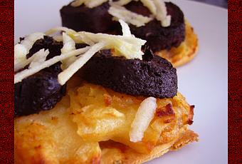 Préchauffez le four à 180°C. Découpez des disques de pâte avec un emporte pièce -le mien était de 8 cm-. Placez les sur une plaque recouverte de papier cuisson. Piquez la pour ne pas qu’elle gonfle. Déposez 1 cuillère de compote et étalez-la. Ne pas trop en mettre car on ne sentirai plus le gout du boudin. Déposez les rondelles dessus et enfournez pour une quinzaine de minutes. A la sortie du four, j’ai râpé un peu de pomme sur le dessus. Dégustez.
