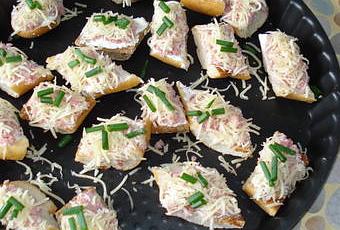 Découper votre baguette en petits morceaux ,mixer votre jambon ,votre fromage de chèvre ,poivrez .Tartiner le morceaux de pain avec votre mixture ,parsemer de gruyère râpé ,quelques tiges de ciboules coupées .