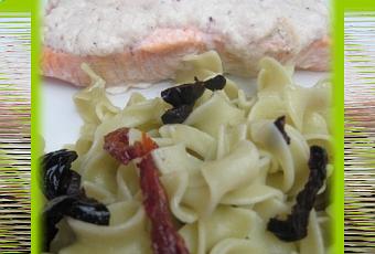 Disposer le saumon et les pâtes dans les assiettes et parsemer les pâtes de petits morceaux d’olives noires et de tomates séchées (cela donne une jolie palette de couleurs : le rose du saumon, le vert des pâtes et le noir et le rouge des olives et tomates ! ).