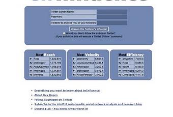 TwInfluence est un outil très simple qui utilise une API de Twitter pour mesurer l'influence combinée entre un utilisateur de Twitter et les personnes qui le suivent (ses followers).