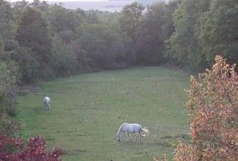 Etivey, domaine de Sèche-Bouteille entouré d’une forêt, trois chevaux dans un champ.