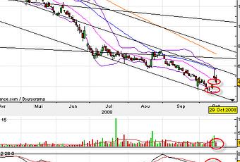 L'action Recylex (RX) devrait sans doute consolider vers la fermeture du gap à 4.20 euros voir celui à 3.80 euros dans les prochains jours. Mais la fin de baisse pourrait bien avoir lieu et cette consolidation préparer le retour haussier du titre pour les prochaines semaines. En effet la MACD est revenue au-dessus de sa ligne de signal et les volumes de cette consolidation sont bien inférieurs à ceux ayant eu lieu pendant les deux journées de hausse successive. Ainsi autour de 4€ le titre Recylex pourrait bien être attrayant et intéressant à jouer dans une perspective moyen terme pour jouer la rupture haussière de la moyenne mobile à 50 jours à 5.50€ d'ici là dernière résistance à un rebond du titre qui semble se dessiner. On visera dès lors un retour sur la moyenne mobile à 100 jours en orange sur le graphique avec en ligne de mire les 7 puis les 10€. On peut initier des positions aux alentours des 4 €, même si les plus prudents attendront la cassure de la moyenne mobile à 50 jours pour se positionner à leur tour.