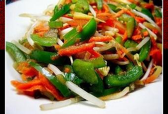 Mettre les germes de soja, les piments, les poivrons, la carotte, les châtaignes d'eau et le céleri dans un saladier. Bien mélanger.