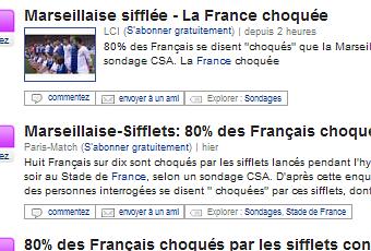 Le scandale de la semaine c’est le match France-Turquie. Inutile de relater ce qui se passe… Le point que je voudrais souligner est l’alignement des grands de la presse française qui sortent la même information et plus précisément le même chiffre que celui indiqué dans le titre. Voici une petite capture de notre ami wikio.fr :