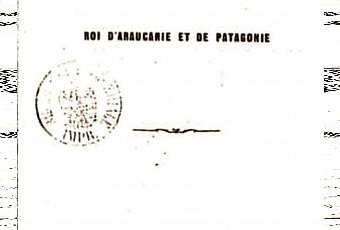 "Le premier qui fut roi fut un avoué malheureux" Publié 52 passage Jouffroy, cette plaidoirie de ce Prince auto-proclamé par une tribu indienne du Chili, fait prisonnier par le gouvernement Chilien pour avoir tente de soulever ces tribus d'Auricanie contre le Chili en faisant passer les indiens d'une rive du Bio-Bio sur l'autre rive (?). Il assure que les Indiens de Patagonie et d'Auricanie l'ont librement proclame roi et adopté son drapeau bleu blanc et vert ! ............... Condamné à mort, triste destinée à laquelle il a échappé. Cet ancien notaire se déclare résolu à exploiter ses connaissances en généalogie, biographie etc.. comme ancien liquidateur en comptes, conseils dans les affaires litigieuses. Il fut libéré sur intervention du gouvernement Français, mais n'abandonna pas pour autant son combat pour trôner sur le territoire de Patagonie et d'Auricanie. Il organisa une vaste publicité pour obtenir des fonds dans le but d'influencer le gouvernement pour parvenir à ses fins. Il tenait des séances chez lui à Paris, et il indiquait : "Les personnes qui voudront bien m'honorer de leur confiance, me trouveront tous les jours sauf le dimanche. Prince O.A.Tounens ancien avoué, roi d'Auricanie et de Patagonie généalogiste et biographe 5 rue de Grenelle Saint-Germain Et une circulaire qu'il adressait à d'éventuels bienfaiteurs : "Sire, voici une créance véreuse que je dépose entre vos augustes mains. Je supplie humblement Votre Majesté de faire vendre s'il le faut, la paillasse de mon débiteur qui est la dernière des canailles, et j'ai l'honneur de remettre à Votre Majesté 12 f 50 c pour ses premières courses" Cette auguste personnalité fréquentait le salon de Nina de Villar. Les successeurs du roi de Patagonie, furent Antoine Cros, le frère du poète, Achile Laviarde, et en en trouve encore aujourd'hui......