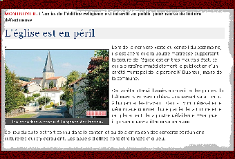 Lors de la dernière visite du conseil du patrimoine, il s'est avéré que la poutre maîtresse supportant la toiture de l'église est en très mauvais état, ce qui a entraîné immédiatement la publication d'un arrêté municipal de la part de M.Dubreuil, maire de la commune.