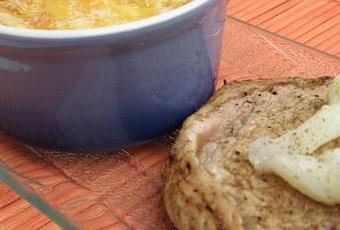 Poêler les noix de veau dans le beurre chaud, saler et poivrer, disposer sur une assiette accompagné d'une cassolette de gratin.