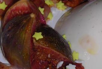 Ouvrir les figues en les coupant sur la hauteur. Il faut inciser en partant du somment jusqu'au 2/3. Disposer les figues dans une poêle et les faire revenir avec le beurre et les bananes coupées en rondelles, et enfin ajouter la cannelle et le miel. Cuire compoter 10mn.