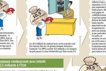 Sans toucher au budget 2009. La recette miracle ? Des mécanismes financiers complexes avec une idée forte : « L’Etat ne fera pas de cadeaux aux banques », dixit Christine Lagarde. Les 10,5 milliards de recapitalisation des 6 grandes banques seront financés par des emprunts de l’Etat, ce qui va alourdir la dette publique, mais la somme est prêtée à un taux d’intérêt de 8%, ce qui devrait au final lui rapporter 2,1 milliards d’euros sur 5 ans. Sauf que l'Etat s'endette à un taux non connu...