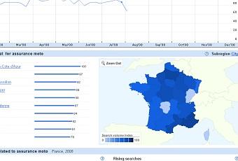 Google Insight for Search est donc un outil qui a ??t?? cr???? sp??cialement pour les agences de communications pour leur donner des informations sur les recherches pour am??liorer la finesse de leurs campagnes. Comme sur Google Trends, on peut entrer un mot-cl?? pour voir le volume de recherche sur le temps, on peut aussi comparer les volumes de recherche de plusieurs mots-cl??s. Enfin on peut affiner les recherches par pays, par ann??es, par r??gion et par cat??gorie (l'article donne l'exemple d'Apple qui en anglais peut ??tre un fruit ou une marque, les recherches connexes sont donc fortement diff??rentes selon la cat??gorie).