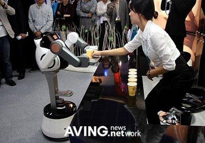 La société coréenne Yujin Robot a présenté récemment un robot barista qui sert café avec grande précision et politesse. Ceux qui ont foi en l'avenir de la robotique ne seront pas impressionnés, il n'empèche que ce doit être assez déconcertant de faire la conversation de comptoir avec un individu de métal. J'aurais vraiment aimé voir ça !