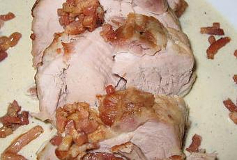 Déposez le filet mignon tranché et les lardons dans la sauce. Servez avec des pâtes.