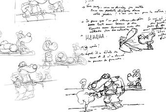 En général, une journée de travail en vacances (hi ! hi !) commence ainsi : petit café dans une grande tasse puis direction l'ordi et la table à dessin juste à côté. L'idéal est d'avoir à l'avance l'idée du strip du jour et de commencer les crayonnés. Ce matin ce n'était pas le cas : alors je me mets à écrire des dialogues sur un bout de feuille (souvent à partir de la chute (sans û) du strip de la veille) - je jette sur le papier des idées en espérant que "le gag du siècle" va arriver. Aujourd'hui il est arrivé vers 13h15 (et ce n'est pas le gag du siècle). En parallèle j'attaque les crayonnés dits rapides (travail sur la position des persos), cela m'aide parfois à avancer sur le scénar. Chaque crayonné rapide est ensuite repris de façon plus précise, plus propre. C'est ce crayonné qui me servira pour l'encrage. Je crois avoir déjà expliqué cette méthode de travail sur ce blog mais aujourd'hui ça m'a fait plaisir de la reprendre !