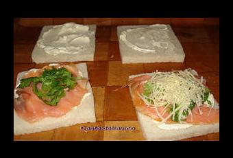 Badigeonner vos tranches de mie de crème fraîche , mettre une demi tranche de saumon fumé ,rajouter des feuilles de coriandre fraîche et parsemer de gruyère râpé .....