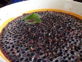 mettre dans une terrine les feuilles et les fruits sans les égrainer. Écraser les fruits grossièrement en les mélangeant avec les feuilles.