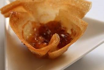 Garnir chaque croustillant de petits morceaux de chèvre et d'une demie cuillère à café de confiture de figues ( les quantités varient suivant la taille de vos moules)