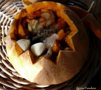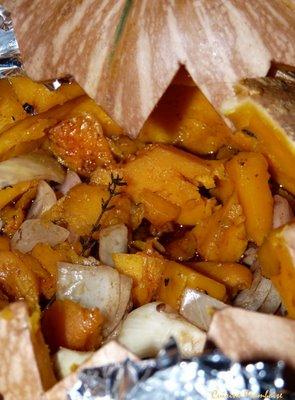 Mélanger les oignons épluchés, émincés et le giraumon coupé en cubes aux autres ingrédients. Mettre le tout dans l'enveloppe de giraumon.