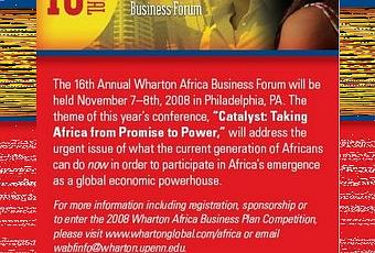 La 16ème conférence économique de l'Association des Etudiants Africains du MBA de l'université de Wharton aura lieu les 7 et 8 novembre 2008. Thème central : "catalyst : taking Africa from Promise to Power".