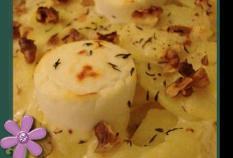 Lorsque les pommes de terre sont cuites, versez-en la moitié dans un plat à gratin préalablement beurré, poivrez et recouvrez de 4 demi-cabécous. Ajoutez le reste des pommes de terre, donnez un tour de moulin à poivre, parsemez des noix. Disposez ensuite les 4 rondelles de fromage restantes.