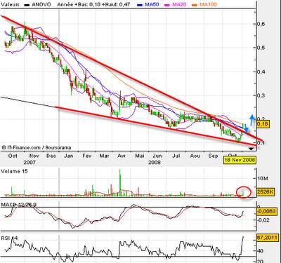 Le titre A novo (NOV) vient de se défaire de la tendance baissière qui était sienne depuis plusieurs longs mois. Le titre a donc su casser à la hausse un biseau descendant après avoir tapé les 0.10€. Le titre après une brève consolidation sur 0.15€ pour fermer le gap devrait revenir végéter sur les 0.20€ avant de lancer une tendance haussière cette fois-ci. On peut se placer sur 0.15€ pour jouer les 0.30€ à moyen terme.