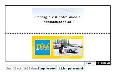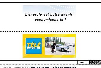Des publicités combinées : en haut, EDF Bleu Ciel et la facture électronique, qui permet d’économiser l’énergie, en bas, en bas, Télé Drive-in, un pub pour la nouvelle Sandero de Logan. Au choix, on peut donc décider d’opter pour l’économie d’énergie, ou au contraire, pour une voiture pas chère et pas très belle, qui, en plus, rejette plus de CO2 qu’une BMW 325d!