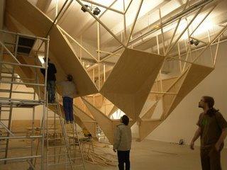 Les œuvres des frères Chapuisat possèdent un charme puissant qui résiste à se dire, une évidence géométrique mal résignée entre le goût enfantin des cabanes bricolées et une rêverie profonde, presque métaphysique, visant les plis et les confins du monde. Et chacune de leurs architectures éphémères, en chacun des lieux qu’elles s’en vont investir, semblent émerger avec une vivacité touchante à la rencontre du monde que l’on porte en soi comme de celui qui s’étend - fondamentalement affecté d’une courbure, disait Leibnitz - s’étirant plis sur plis à l’infini. On serait tenté de dire que sous leur allure fruste souvent, leur coté bricolé qui les fait ressembler à des film de Michel Gondry, elles ont la profondeur du monde et blottissent dedans elles des équipées spatiales, des cavernes aventureuses et un peu de la géométrie du ciel. On les fréquente comme des lieux essentiels qui nous tiennent en suspend et, pareils à l’aleph borgésien, ne consentent à se dire que dans une ébauche de poétique de l’infini. Peut-être faudrait-il dire d’abord ici que l’espace est un désir. Désirer n’étant pas, comme le rappellent Deleuze et Guattari dans l’anti-œdipe, être attiré par quelque chose qui nous manque, mais produire ou construire un ensemble, désirer dans un champs, un réseau. Assurément dans ces formes anguleuses surgies dans les galeries, comme dans ces terriers et tunnels poussés à travers les murs, émerge ce désir enfantin de faire des lieux, de s’approprier le monde. Pour plagier Perec dans son introduction aux espèces d’espaces, l’installation proposée pour l’exposition de la villa Arson encore une fois ce n’est « pas exactement le vide, ce serait plutôt ce qu’il y a autour ou dedans ». Rien, de l’impalpable, du pratiquement immatériel, et comment cet impalpable de l’espace se loge en nous comme nous logeons en lui.