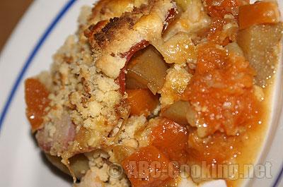 Cette recette est inspirée d’une recette trouvée sur ELLE.fr. J’ai réduit les quantités, et apporté quelques modifications. Je ne sais pas quelle quantité de Comté j’ai utilisée, j’ai fait à l’oeil. Il faut qu’il y en ait un peu partout, mais ça ne doit pas recouvrir la pâte à crumble pour autant; c’est le petit plus qui fait du bien.